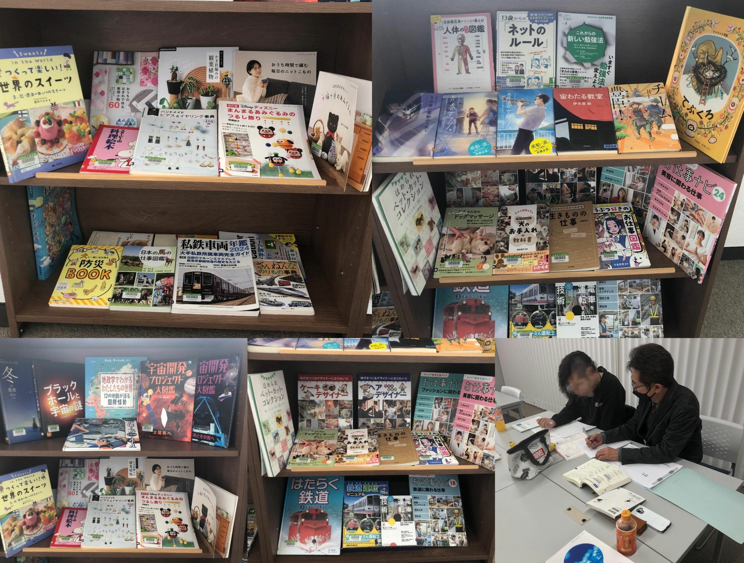 午後からは1月の図書の入れ替えを行いました。おなじみの鉄道関係、手芸や料理、宇宙関係の本に加え、「チーム豊臣」、午年にちなんだ馬に関する本、そして今月末に予定している特別活動「トリミング体験」に関連した本も並びました。